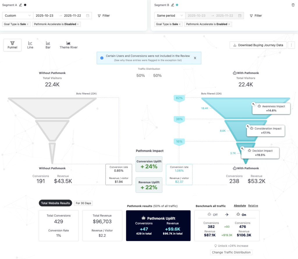 The outcome? Pathmonk consistently outperformed the control group at every stage of the funnel—awareness, consideration, and decision—validating its effectiveness in guiding users through a complex e-commerce journey.